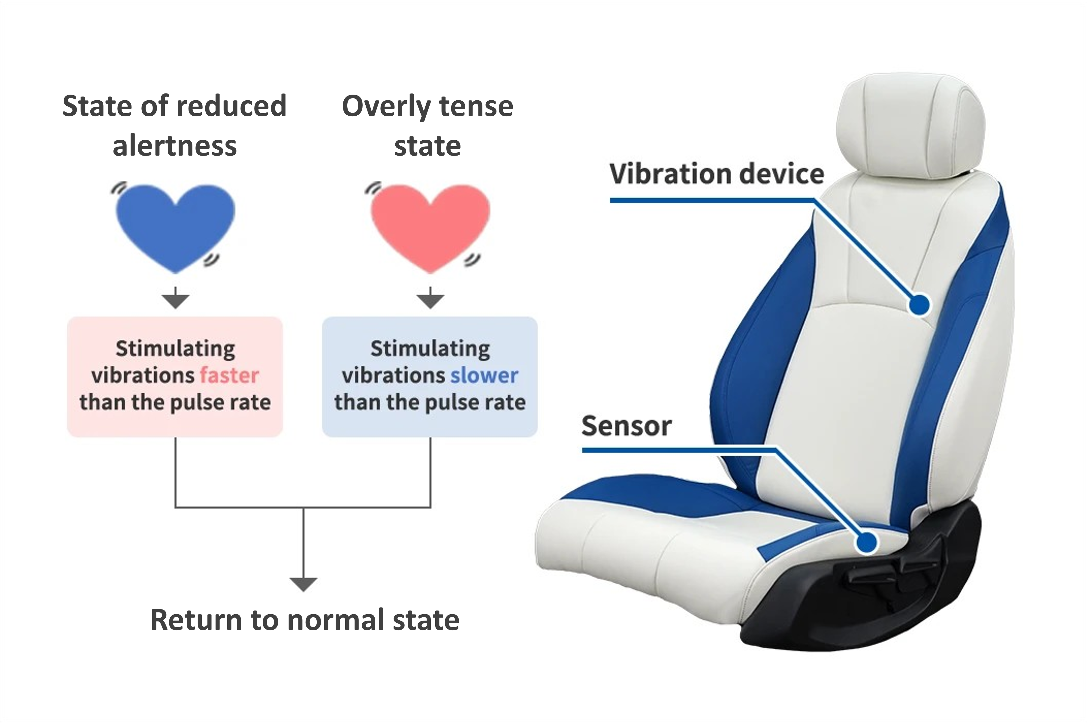 This seat supports driving by maintaining the normal pulse rate, stimulating passengers with vibrations based on their pulse rate data, sensed by a sensor inside the seat and a smart watch.