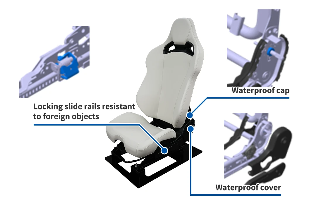 By incorporating adjustability, this buggy seat for use under tough conditions encourages a comfortable seating posture that suits the passenger’s physique. Its adjustable mechanism has a cap and a cover to keep it clean, and it uses locking slide rails that remain movable even if exposed to foreign objects. This buggy seat with adjustable mechanism delivers both toughness and comfort.
