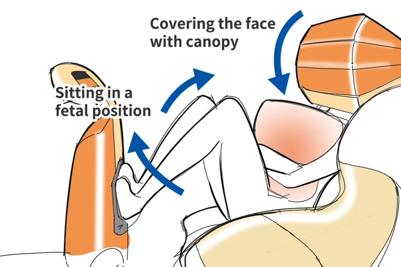 The seat arrangement allows a fetal-like posture to create a relaxing and reassuring space