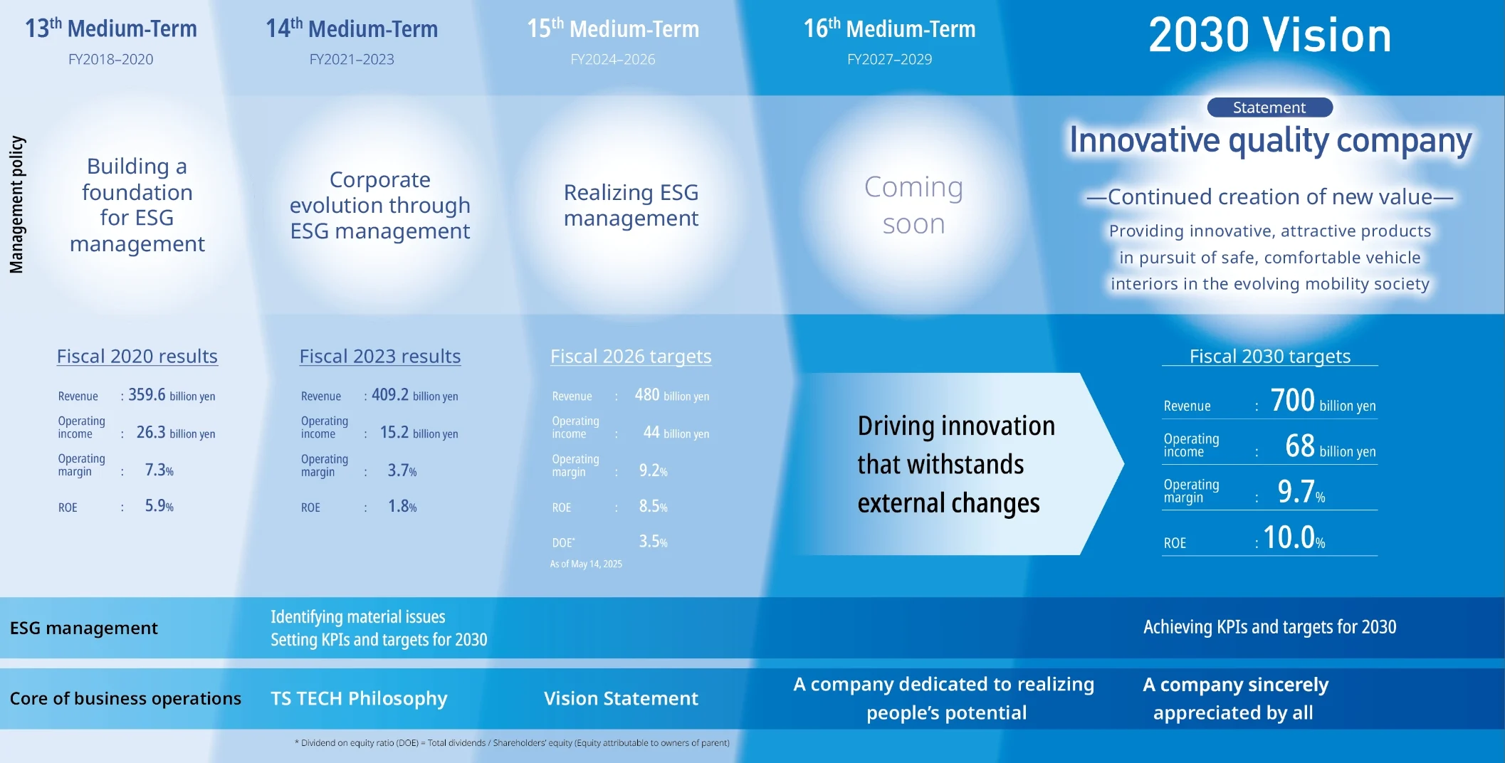 The TS TECH Group’s Vision Statement—“A company dedicated to realizing people’s potential, a company sincerely appreciated by all”—underpins all of its business operations. By providing the world with attractive products even in the evolving mobility society, we will not only achieve our 2030 Vision but also help to build a more sustainable world. In doing so, we will continue to serve as a reassuring presence for all our stakeholders and be a company sincerely appreciated by all.