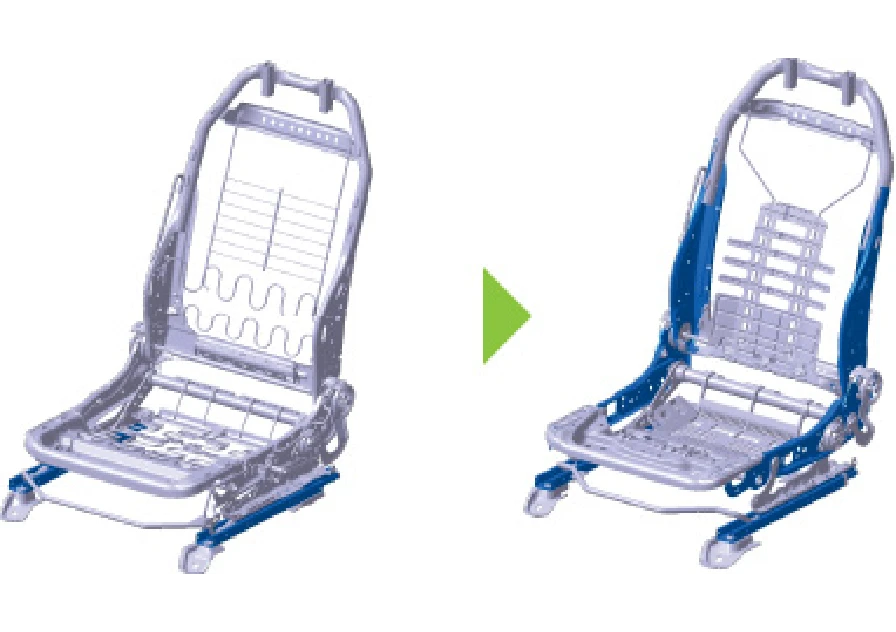 シートフレームは、安全性や快適性を向上させつつ、さまざまな軽量化技術によって大幅な軽量化を実現しています。