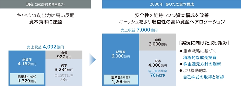 当グループはリーマンショックや東日本大震災、昨今の新型コロナウイルス感染拡大など、厳しい事業環境下においても着実にキャッシュを創出できる収益体質を構築してきました。その結果、2023年3月末時点においてグループ全体で1,329億円のキャッシュを保有し、連結自己資本比率78%と極めて高い安全性を確保しています。しかし、2030年ビジョンを達成し、当グループがステークホルダーの皆さまから喜ばれる企業であり続けるためには、これまで以上に資本を効率的に活用し、成長速度を加速させていく必要があります。