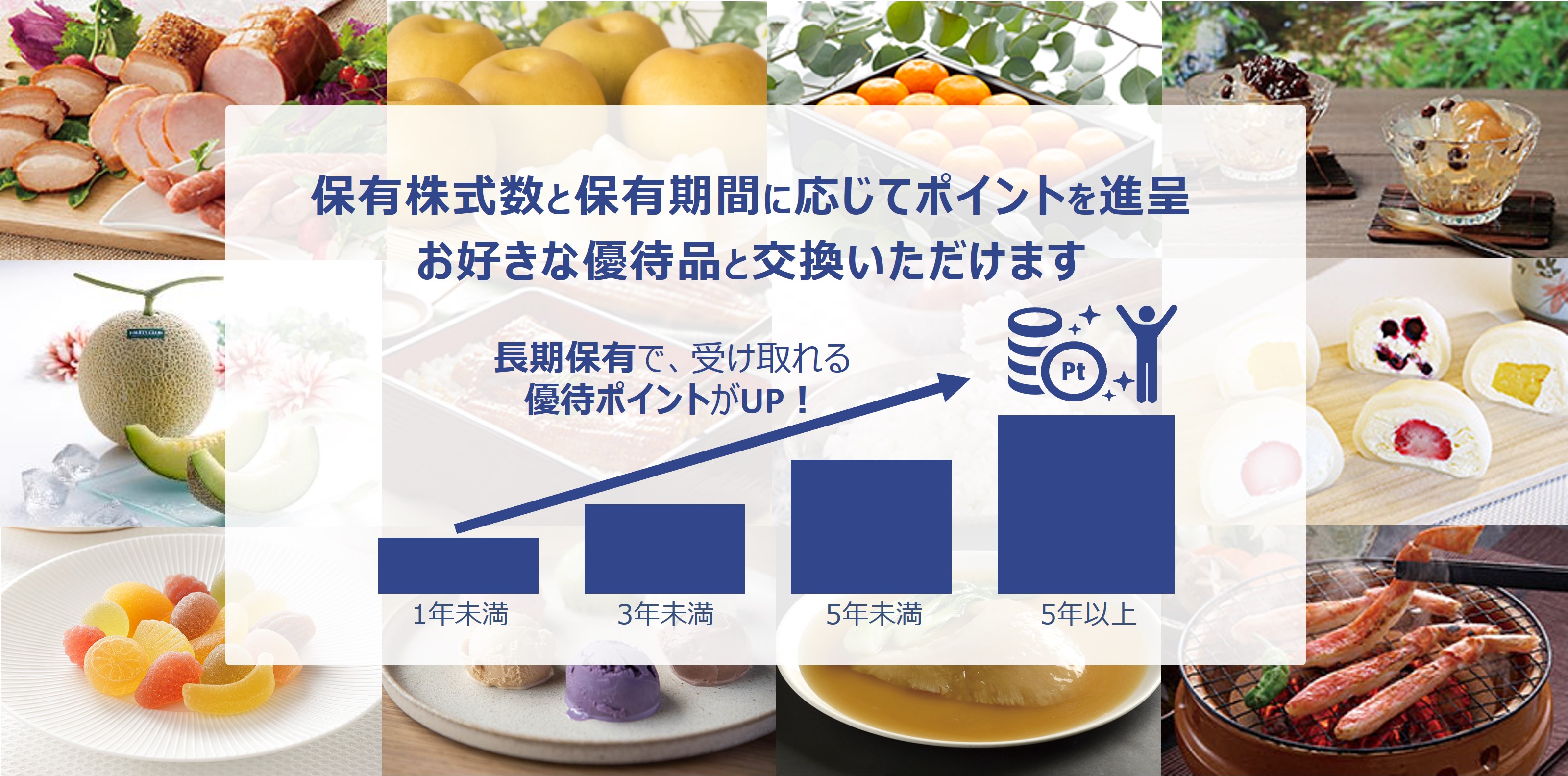 - 株式の追加取得により「保有株数」の区分を超え、異なる区分に移行した場合、継続保有期間は引き継がれませんが上位の保有区分へ移行し、より充実したご優待品をお受け取りいただけます。詳しくは「よくあるご質問」をご覧ください。