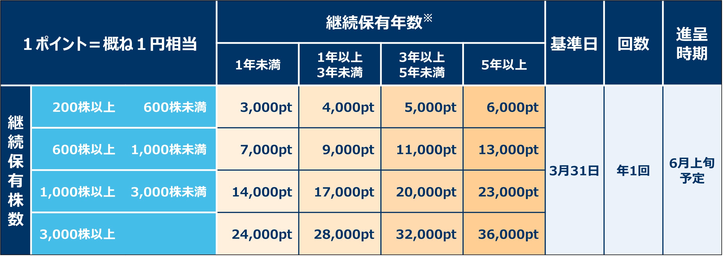- 9月30日および3月31日現在の株主名簿において、同一株主番号により連続で記録された回数および保有株数に基づき決定します。