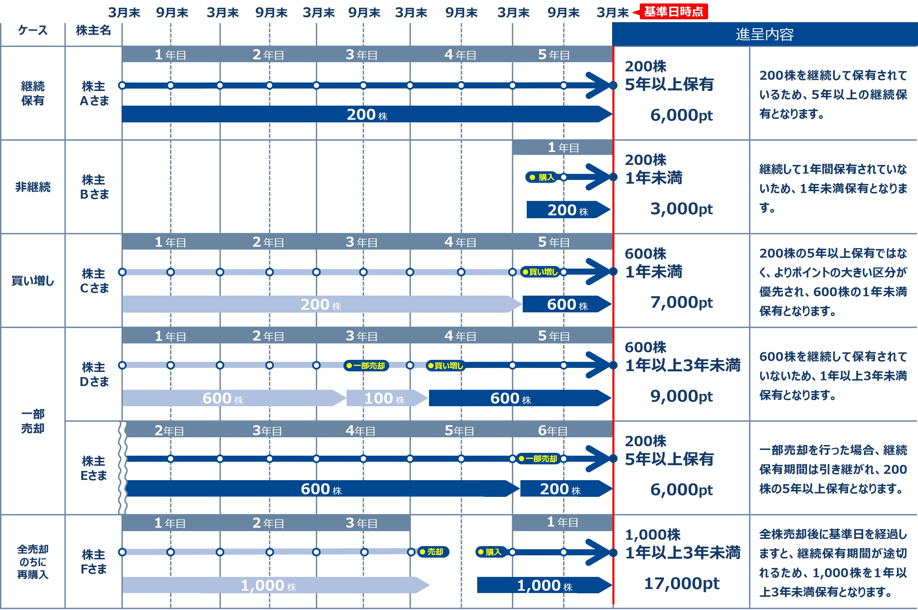 例えば、600株を5年以上にわたり保有している株主さまが、一部売却により次の基準日時点で200株を保有されている場合、継続保有期間は引き継がれ、「200株以上600株未満」を「5年以上」保有した場合に付与される6,000ptが贈呈されます。